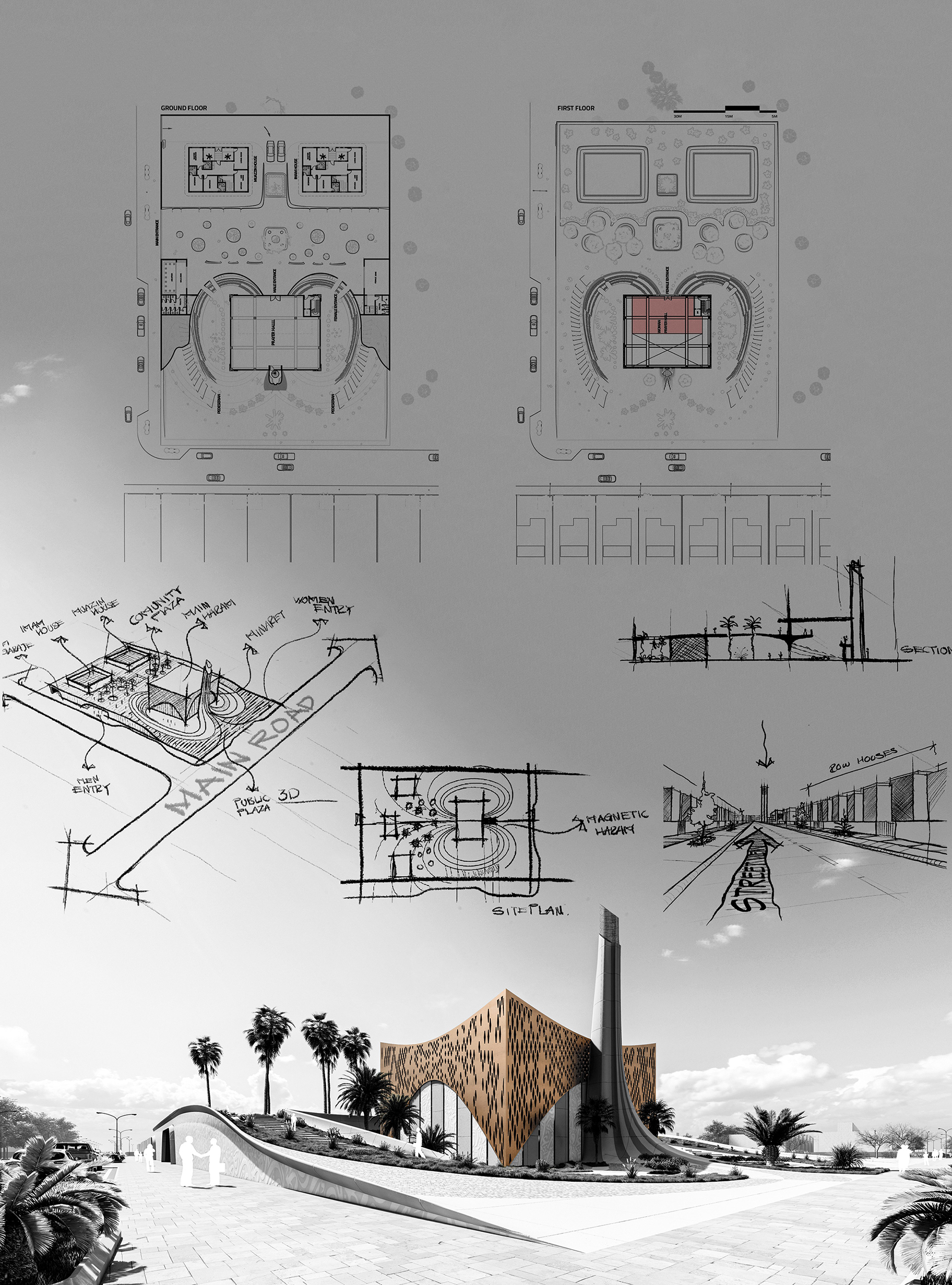 -The main concept of the project is the idea of “magnetic field” that the Haram as the main magnet attract people to itself with the positive energy that it has because the mosque is full of positive energy, and this translated in to two dimensional in the landscape around the haram and in three dimensional in the elevation of the site which starts from zero as a ramp rases to the height of the first floor.