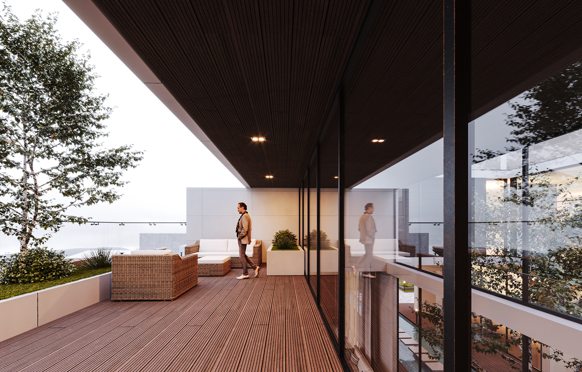 The house's 8-meter cantilevered bedroom in the northern section offers two breathtaking views: one of the west side and the landscape to the east (including the swimming pool), which distinguishes the villa from its surroundings.