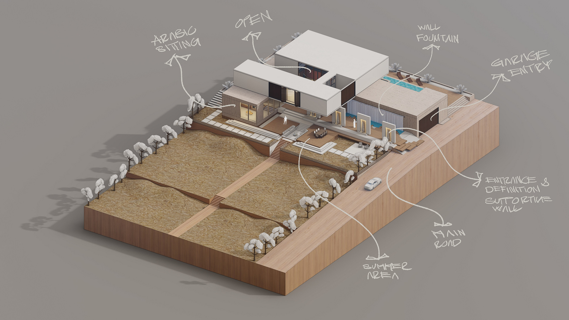 we try to position the house at the back of the plot in order to keep as much space as possible in front of the house and also to take advantage of the site levels, for the garden and terraces with locating the swimming pool behind to have its own privacy.